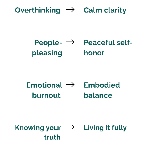 Over 12 weeks, you’ll move from feeling stuck or uncertain to calm, confident, and living more in alignment with yourself. Every session, exercise, and strategy is designed to help you embody your transformation, not just understand it.